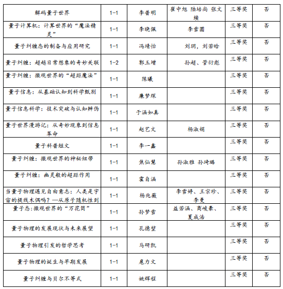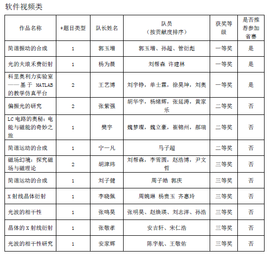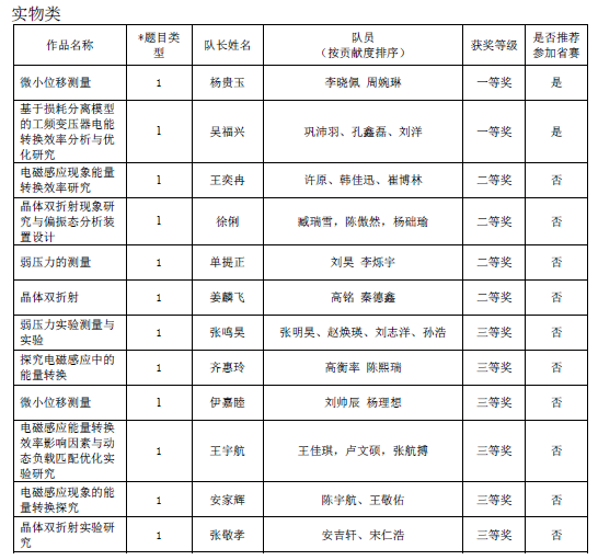 为进一步激发大学生对大学物理和物理实验课程的学习兴趣和学习潜能,在实践中培养学生的创新精神和实践能力,在竞争中提升学生的团队协作意识和综合素质,不断深化高校的物理实验教学改革,理学与信息科学学院于2025年5月至2024年7月举办了Williamhill中文大学生物理实验大赛(量子信息类、软件视频类、实物类)。本次大赛由创新创业学院主办,理学与信息科学学院承办,物理教学部协办,共有399名学生参加。通过多轮选拔评审,最终评选出获一等奖 、二等奖 、三等奖的队伍以及参加2025年山东省大学生物理实验大赛量子信息类、软件视频类和实物类三个赛道的队伍。现将获奖名单公布如下: