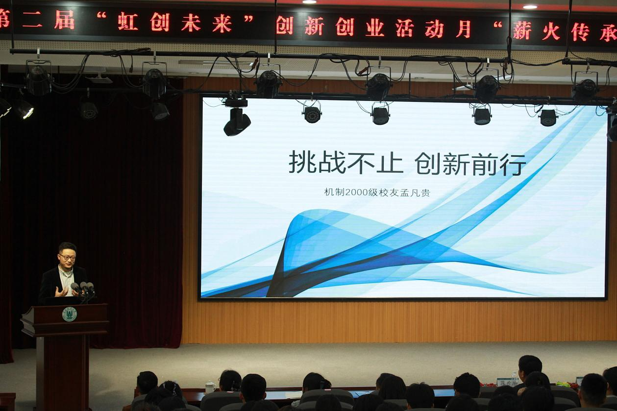 孟凡贵以《挑战不止,创新前行》为题,向同学们分享了他从大学期间两“战”挑战杯,结缘步步高,创立海贝音乐逐渐受到市场肯定、发展为行业龙头的经历。他鼓励同学们积极参与创新创业相关竞赛,以饱满的热情坚定的信念勇攀高峰,书写属于自己的青春答卷。