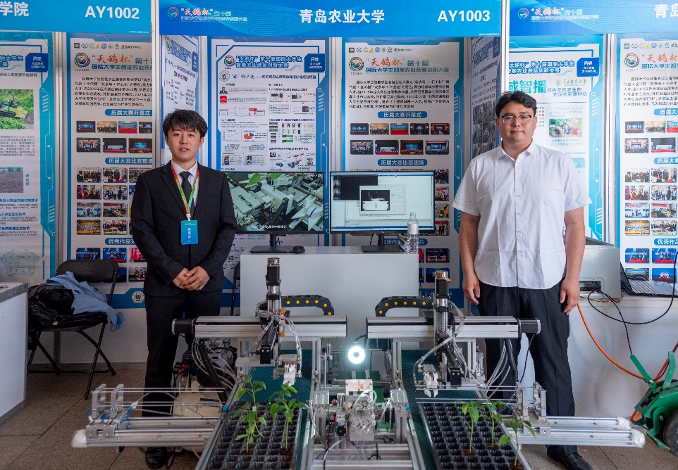 由王家胜和高春凤老师指导的《“嫁”喻户晓——对称结构式蔬菜单株精准嫁接创领者》项目荣获特等奖,该项目用于茄科蔬菜的全自动嫁接,解决嫁接过程中存在的苗株定位难、对接调整难、上夹稳定难等痛点问题,设计研发了一款可实现苗株的定位、夹持、输送、切削、对接、上夹等嫁接全流程连续性作业的茄科蔬菜嫁接机器人,在提高嫁接精度的前提下,通过优化方法和结构极大的降低了设备生产成本。