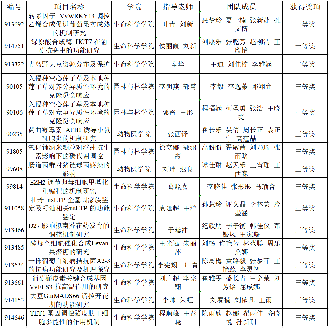 经过激烈角逐,生命科学学院入选的17支队伍共斩获一等奖2项,二等奖1项,三等奖8项。其中惠梦玲团队(指导教师:叶青、刘新)“转录因子VvWRKY13调控乙烯合成促进葡萄果实成熟的机制研究”、刘康乐团队(候丽霞、刘新)“绿源酸合成酶HCT7在葡萄抗寒中的功能研究”获得全国一等奖,王迪团队(指导教师:辛华)“青岛野大豆资源分布及保护”获全国二等奖。
