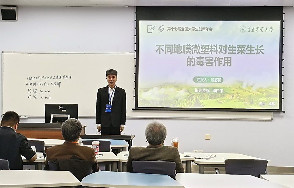 入选项目为资源与环境学院副教授周伟伟指导的《不同地膜微塑料对生菜生长的毒害作用》。该项目聚焦农用薄膜土壤残留问题,比较研究了传统生物不可降解地膜与新型生物可降解地膜微塑料对生菜生长的毒害影响,发现新型生物可降解地膜微塑料对生菜生长的毒害作用显著大于传统不可降解地膜微塑料,为农膜微塑料特别是新型生物可降解微塑料的污染防控提供了重要理论依据。该研究成果已发表在环境领域国际著名期刊《Environmental Pollution》上,项目组成员段舒畅作为代表在年会上进行了汇报交流,体现了学校强化创新创业教育的育人成效,展示了青农学子积极投身创新实践的精神面貌。