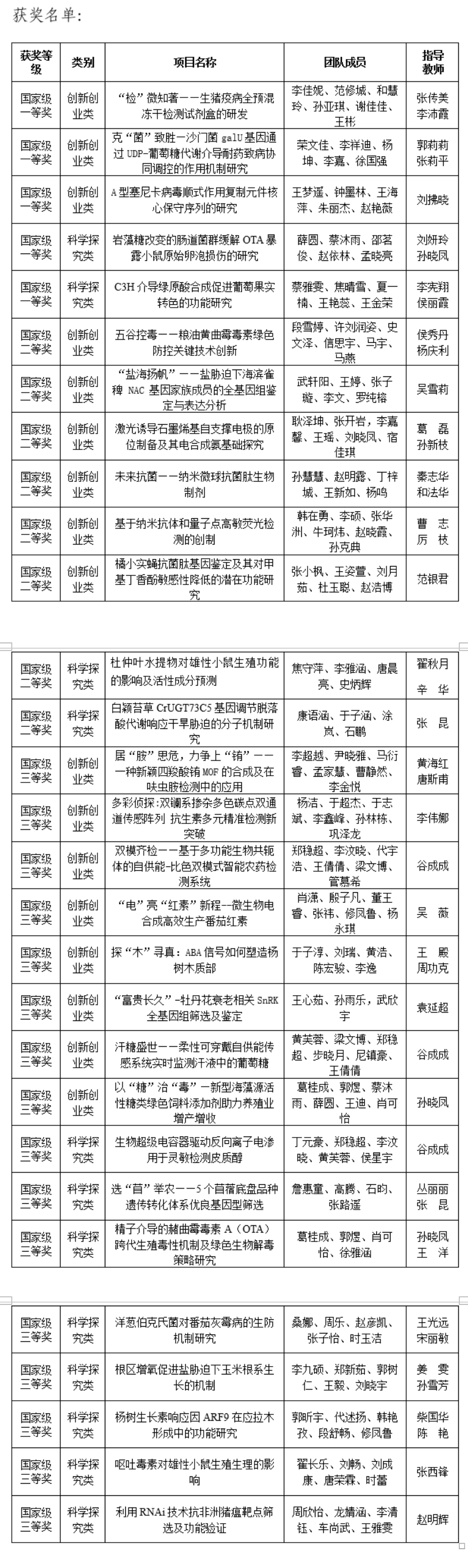 此外,在全国大学生生命科学竞赛科学探究类赛道中共获得一等奖两项,分别是刘妍玲、孙晓凤老师指导的《岩藻糖改变的肠道菌群缓解OTA暴露小鼠原始卵泡损伤的研究》,基于机体“肠-性腺轴”机制,证明岩藻糖改变的肠道菌群能够缓解赭曲霉毒素A对小鼠的生殖毒害,为岩藻糖应用于牲畜饲料、绿色解毒提供了理论依据;农学院李宪翔、生命科学院侯丽霞老师指导的《C3H介导绿原酸合成促进葡萄果实转色的功能研究》,聚焦葡萄果实转色问题,首次揭示绿原酸合成关键酶C3H介导绿原酸合成在葡萄果实花色苷积累中的重要作用,促进葡萄果实转色,为开发植物源转色调节剂提供理论支持。