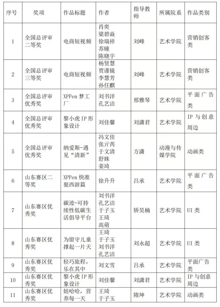 在2024年第16届全国大学生广告艺术大赛(简称“大广赛”)中,我校共获得国家级二等奖1项,三等奖1项,优秀奖3项,省级二等奖1项,优秀奖16项。